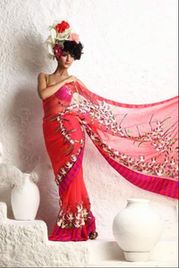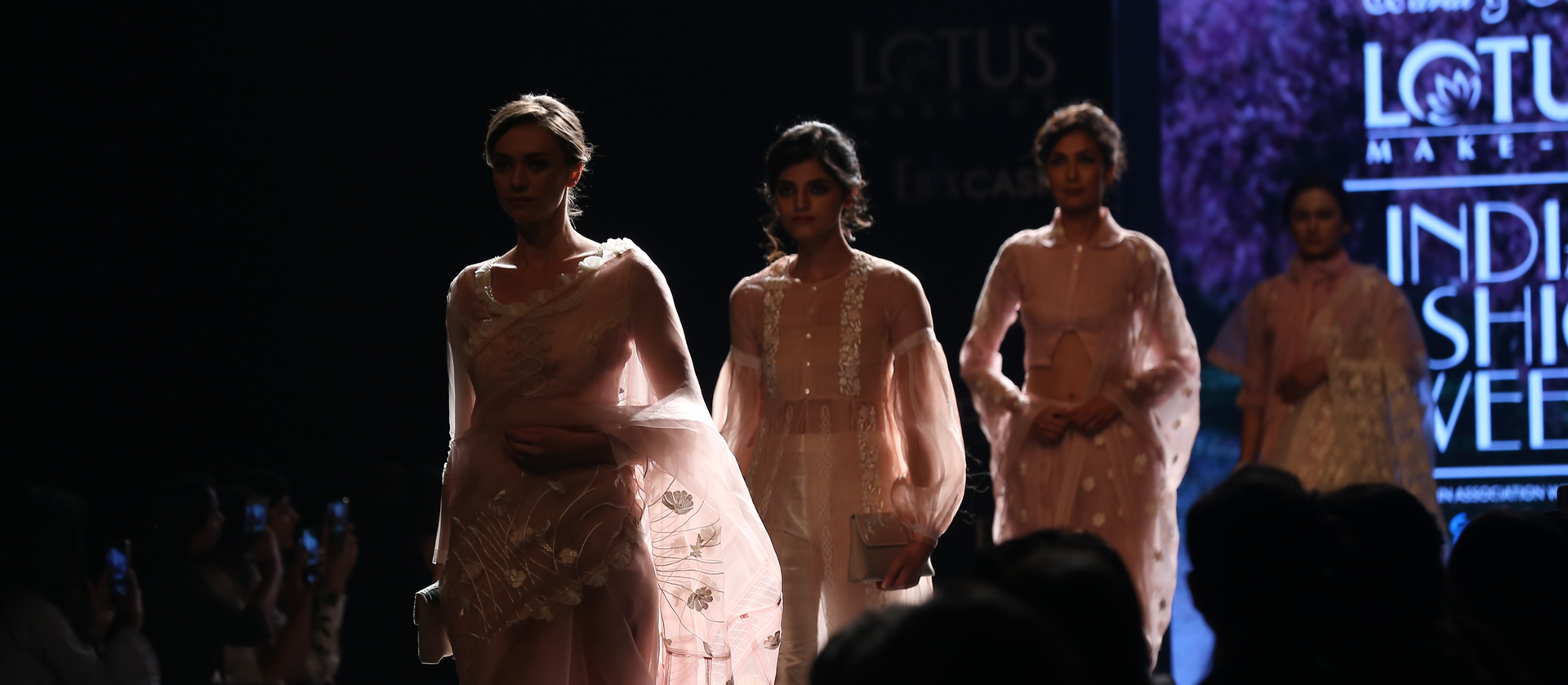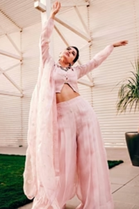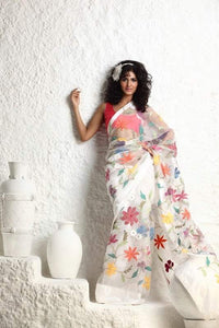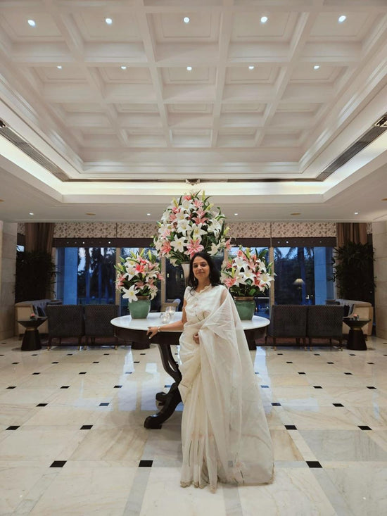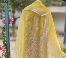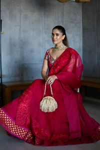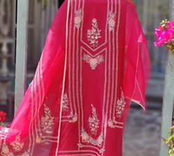 We use premium fabrics like pure silk organza, chanderi and satin. Each product page details the fabric composition.