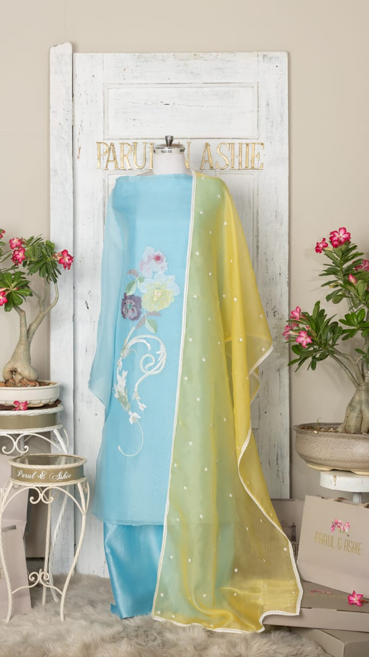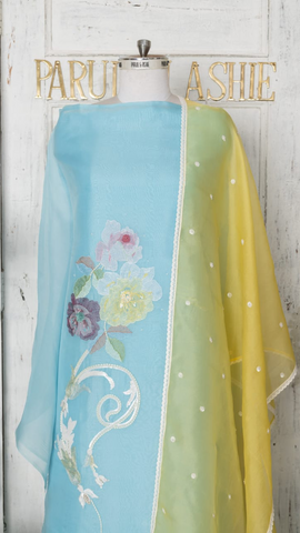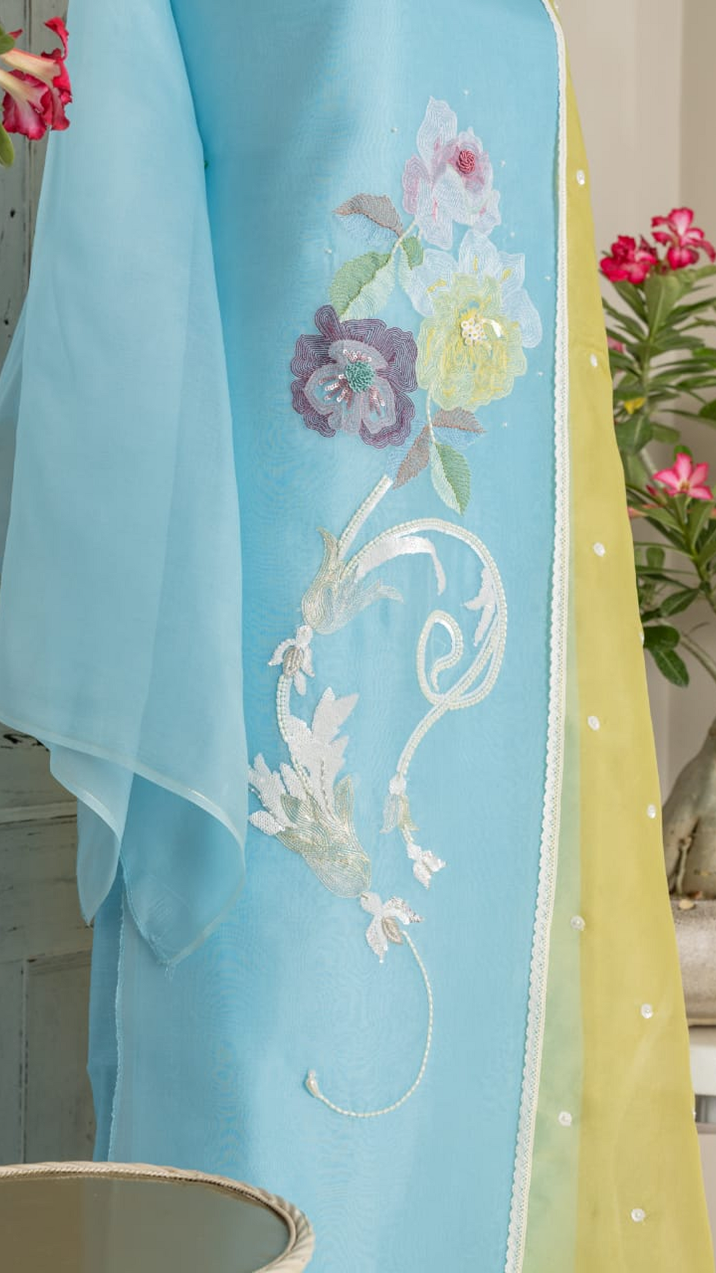 An elegant blue organza kurta with intricate hand embroidery, paired with a contrasting yellow organza dupatta embellished all over. Styled with blue chanderi lowers and lining for a vibrant two-tone appeal.