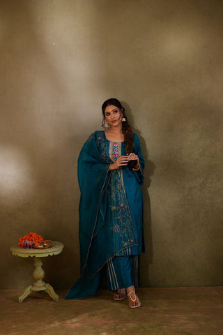 A striking teal summer silk suit, detailed with intricate hand embroidery on the yoke and soft pleats that add structure and grace. The ensemble is completed with a matching teal organza dupatta featuring a delicate hand-embroidered border on one side. Perfect for elegant day events or festive gatherings.