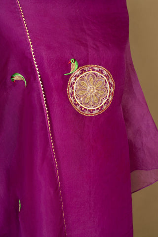 A rich wine coloured organza suit featuring intricate hand embroidery on the chest, embodying regal charm. The matching wine organza dupatta is delicately hand-embroidered with parrot motifs, adding a touch of playfulness to the elegant silhouette. The same colour chanderi fabric for lining and lowers completes this luxurious ensemble.