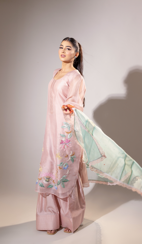 Stitched Blush Pink Organza Suit with Embroidered Hem Sale
